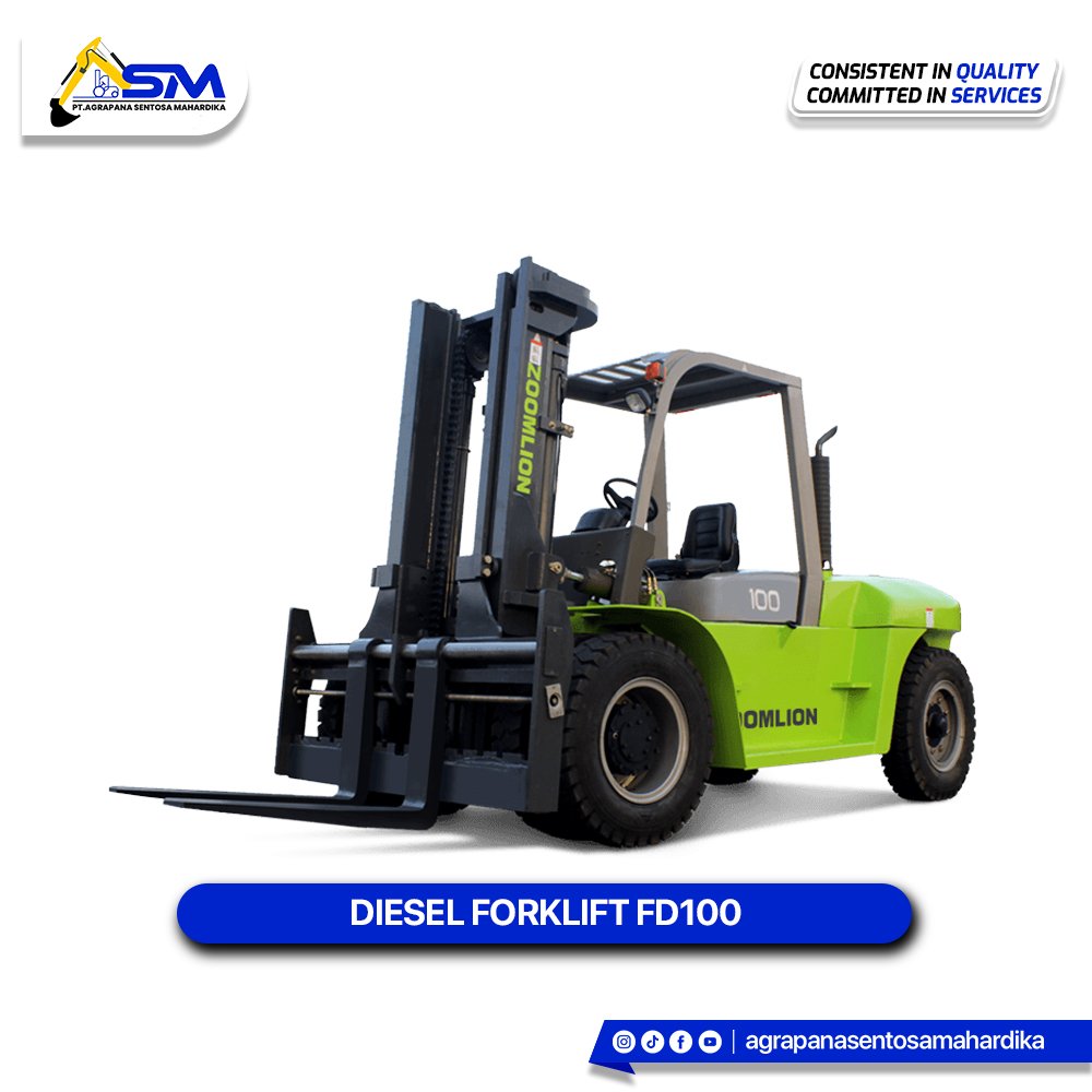 The Zoomlion FD100 is a Diesel-powered forklift designed for a high rated capacity of 10,000 kg at a 600 mm load center.