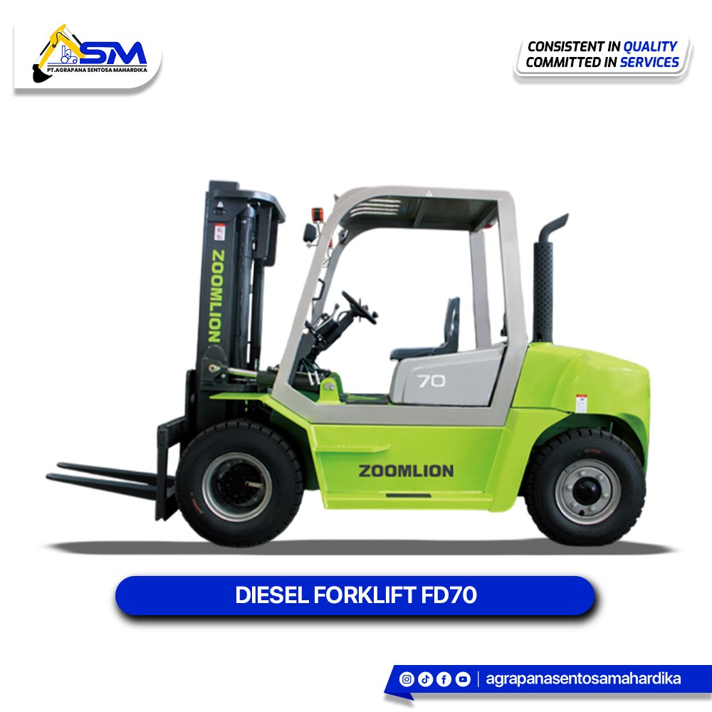 The Zoomlion FD70 is a Diesel-powered forklift with a rated capacity of 7,000 kg and a 600 mm load center.