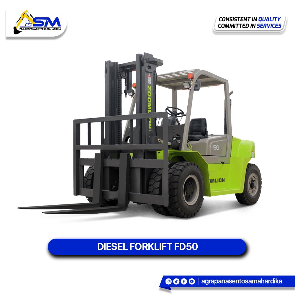 The Zoomlion FD50 is a Diesel-powered forklift with a rated capacity of 5,000 kg and a load center of 600 mm.