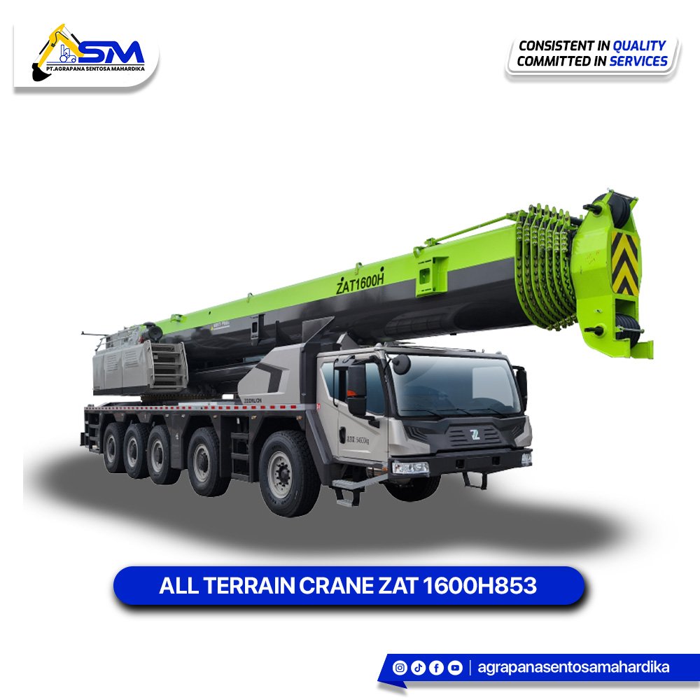ZAT1600H All Terrain Crane is a high-capacity crane with a maximum rated lifting capacity of 160 tons. It features an impressive 88.0m main boom and an optional jib up to 33.5m, achieving a maximum lifting height of 116.5m. Key operational metrics include a maximum hoist rope speed of 135 m/min and a minimum turning diameter of only 18.5 m. The crane is highly mobile (Max. driving speed 80 km/h) and powerful, utilizing a WP12.460E50 engine (338 kW) for the carrier and an H-type outrigger spread of 8.3m x 9.23m for stability. The overall dimensions in driving condition are 17015×3000×4000 mm with a deadweight of 61,800 kg.