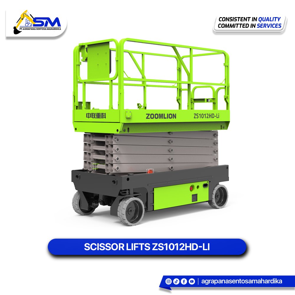 The Zoomlion ZS1012HD-Li is a scissor lift from the HD-Li series powered by a 230Ah Li-ion battery. It offers a maximum working height of 11.80m (38ft 9in) and a platform capacity of 350kg (770lb). Key standard features include a 5-year battery warranty , proportional controls, a load sensing system, and the ability to be driven at full height. The unit has a gross weight of 2900kg (6395lb).