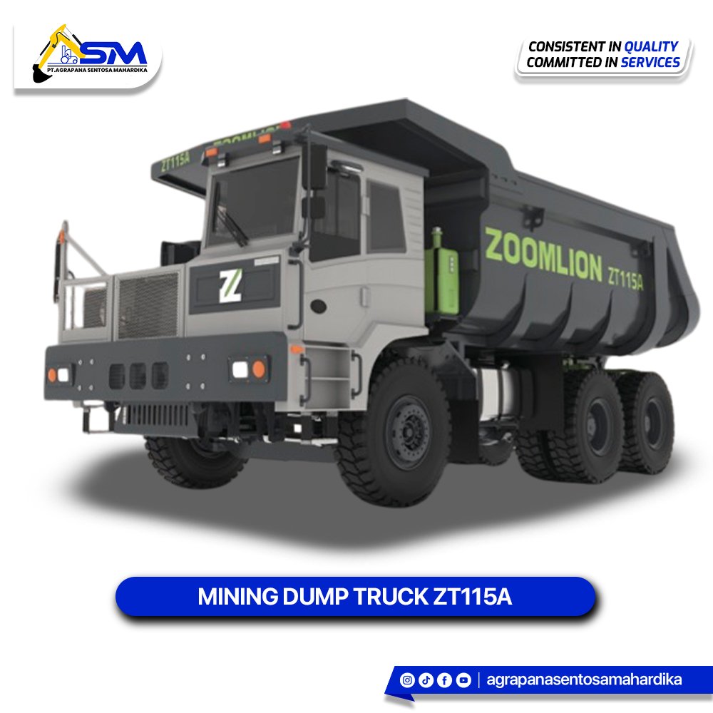 The ZOOMLION ZT115A is a heavy-duty mining dump truck with a Rated payload of 75 t. It is powered by an engine (Model YCK13580-T400) delivering a Rated power of 426 kW and adheres to the China Non-road Stage III emission standard. Key features include a robust riveted, double-layer high-strength steel plate frame (12+12) and a large heaped capacity of 34 m³. It offers a Max. speed of 45.6 km/h and has an optional automatic transmission.