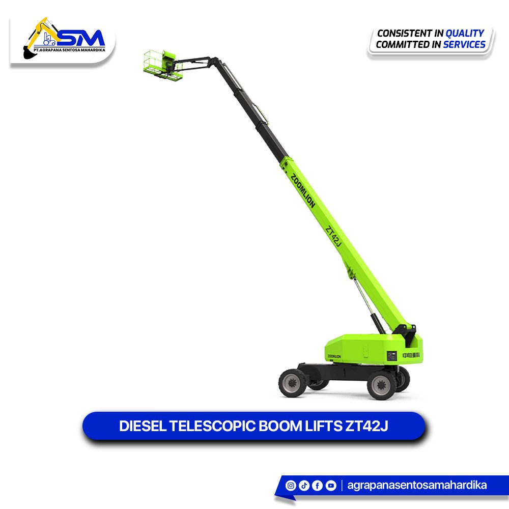 The ZOOMLION TELESCOPIC BOOM LIFT ZT42J is a robust and efficient, CE-compliant telescopic boom lift, offering a 44.08m working height and 25m horizontal outreach, with a dual platform capacity of 300/454kg. It features a rigid hexagonal boom for superior anti-fatigue performance, a rough terrain chassis with a swing axle for 45% gradeability, and a 30% increase in boom telescopic efficiency, making it a reliable solution for challenging high-altitude work.