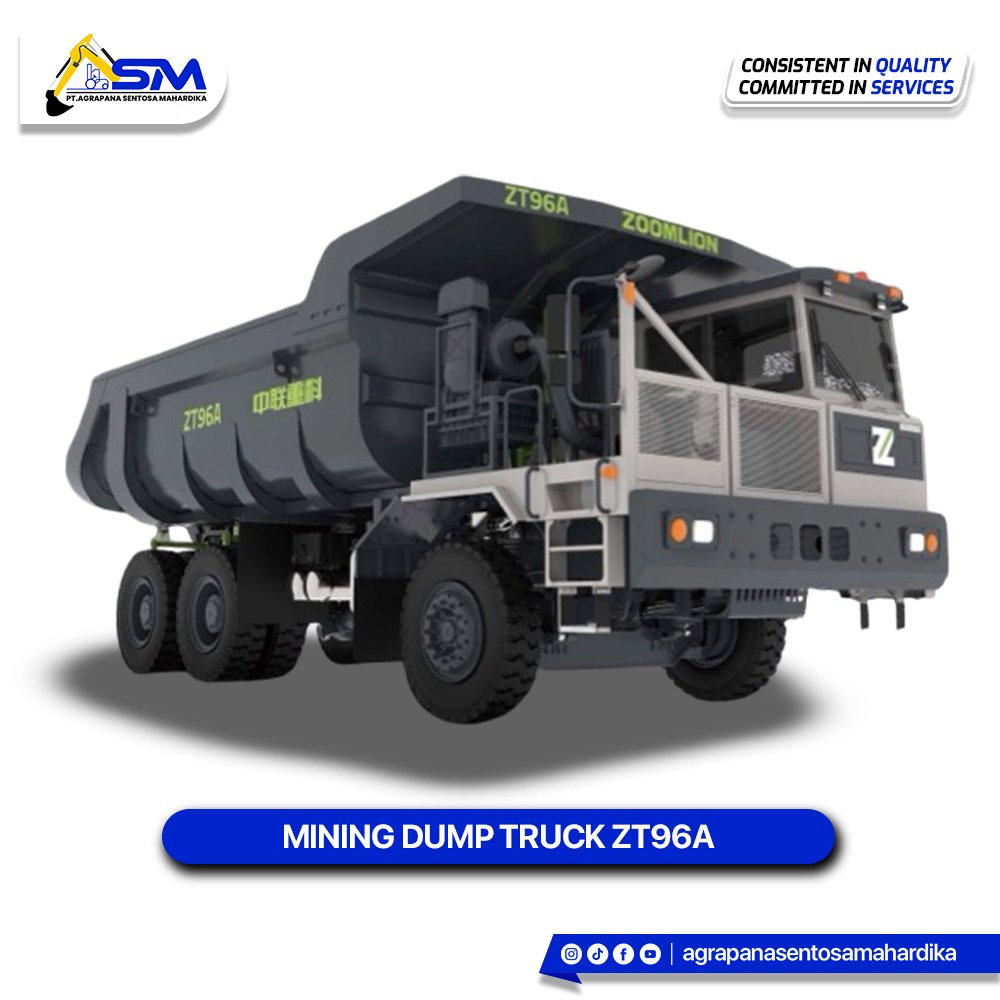 The ZOOMLION ZT96A is a 60-ton rated mining dump truck. It is powered by a 353 kW (480 Ps) engine (YCK13580-T400, China Non-road Stage III emission) and features a robust double-layer frame (10+10mm 610L material). It offers a large heaped capacity of 36 m³ and a Max. speed of 45.6 km/h (Manual Transmission). The truck uses a reliable leaf spring suspension system for enhanced stability.