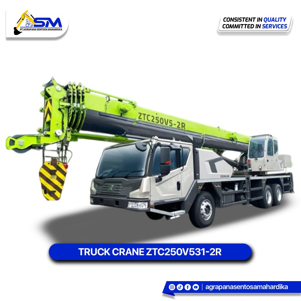 ZTC250V531-2R Truck Crane is a 25-ton capacity crane featuring a five-section telescopic main boom (10.5m – 41.0m) and an 8m jib, achieving a maximum lifting height of 48.9m. It uses an open-type hydraulic system with 5-lever manual proportional control, H-type outriggers (including a 5th outrigger for 360° operation), and a maximum hoist rope speed of 120 m/min